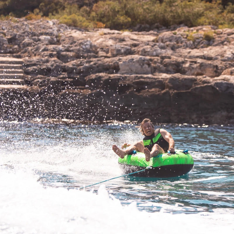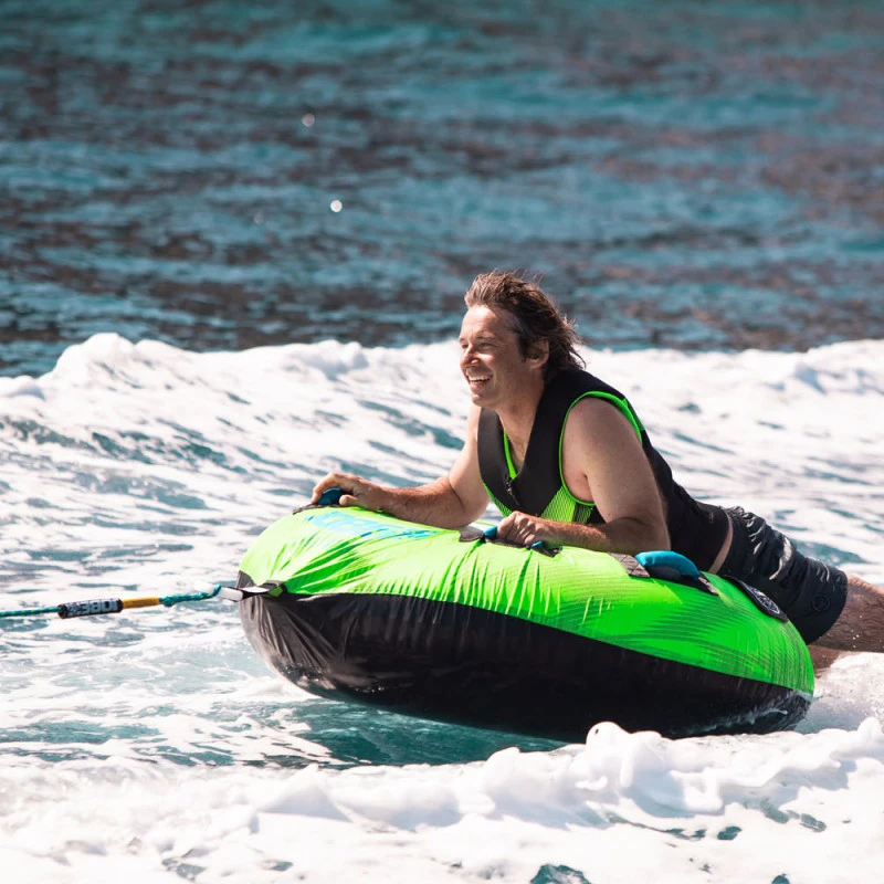 La bouée de traction Rumble est prévue pour un usage en solo assise ou à plat ventre. Tous les accessoires sont offert : gonfleur électrique, corde de traction, drapeau de sécurité, attache quick connect.